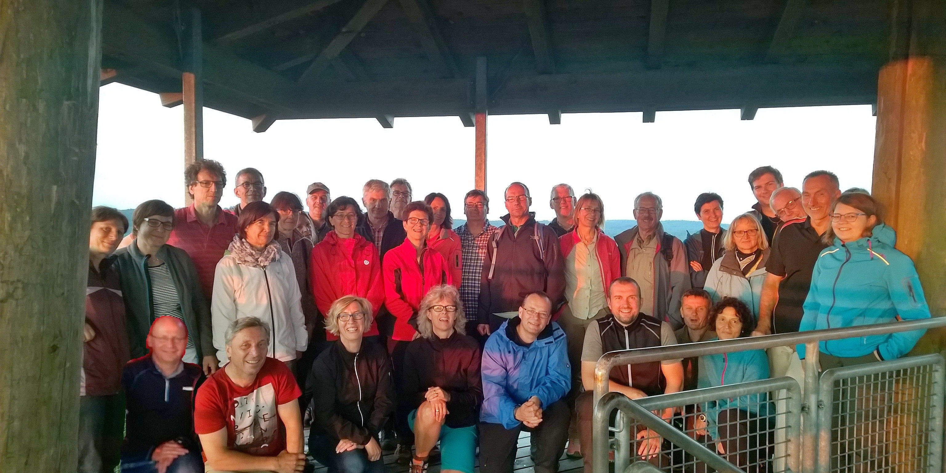 Nach der Rast ging es frisch ausgeruht und gestärkt weiter am Volkmarsberg vorbei, über Waldwege und offene Wiesen, in Richtung Aalbäumle. Mit ständiger Begleitung des Vollmondes trafen wir in dieser tropischen Nacht früh um 04:30 Uhr am Fuße des Turmes ein. Die Nacht verschwand zunehmend schneller und in Erwartung an den frühen Tag stiegen wir die Treppen zur Aussichtsplattform hoch. Bei einem „Traumwetter“ und dem Nachdenken der letzten 20 km konnten wir alle gemeinsam um 05:25 Uhr den Sonnenaufgang über dem Härtsfeld genießen – herrlich!